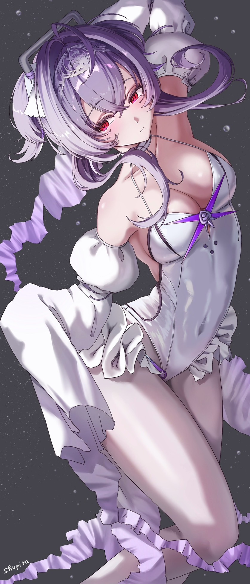 1girlahogeair bubblearm upblushbreastsbubblechokercleavagecovered naveldetached sleevesfrillshair between eyeshair intakeshairbandheadgearleotardlong sleeveslooking to the sidemedium breastspantyhosepurple hairred eyesshort hair with long lockssignaturesleeves past fingerssleeves past wristssolounderwaterwhite chokerwhite leotardwhite pantyhosewhite sleeves