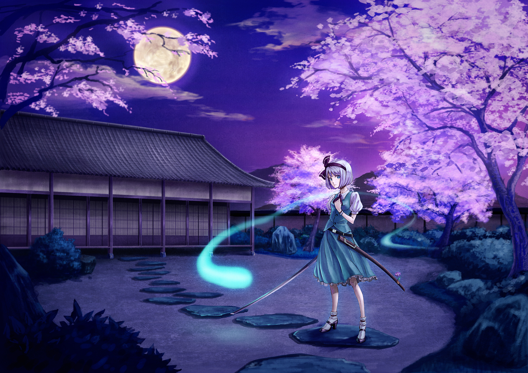 1girlarchitecturecherry blossomseast asian architecturefemale focusfull moonghosthairbandhitodamakatanamoonnightpurple skyribbonscabbardsheathshort hairskysoloswordweapon