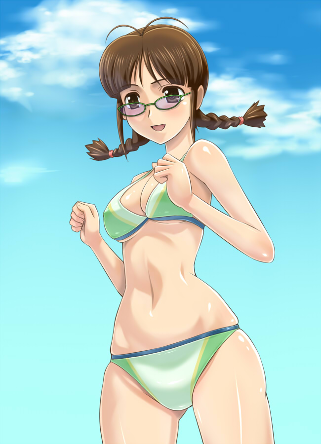 00s1girlantenna hairbare shouldersbikinibraidbreastsbrown eyesbrown haircleavageclouddayfemale focusglassesmedium breastsoutdoorsshort hairskysoloswimsuittwin braids