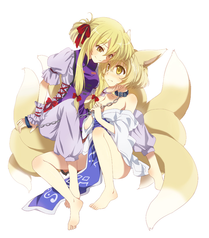 2girlsanimal earsbarefootblonde hairchaincollarfeetfemale focusfox earsfox tailkitsunekyuubileashmultiple girlsmultiple tailsshort hairtailyellow eyes