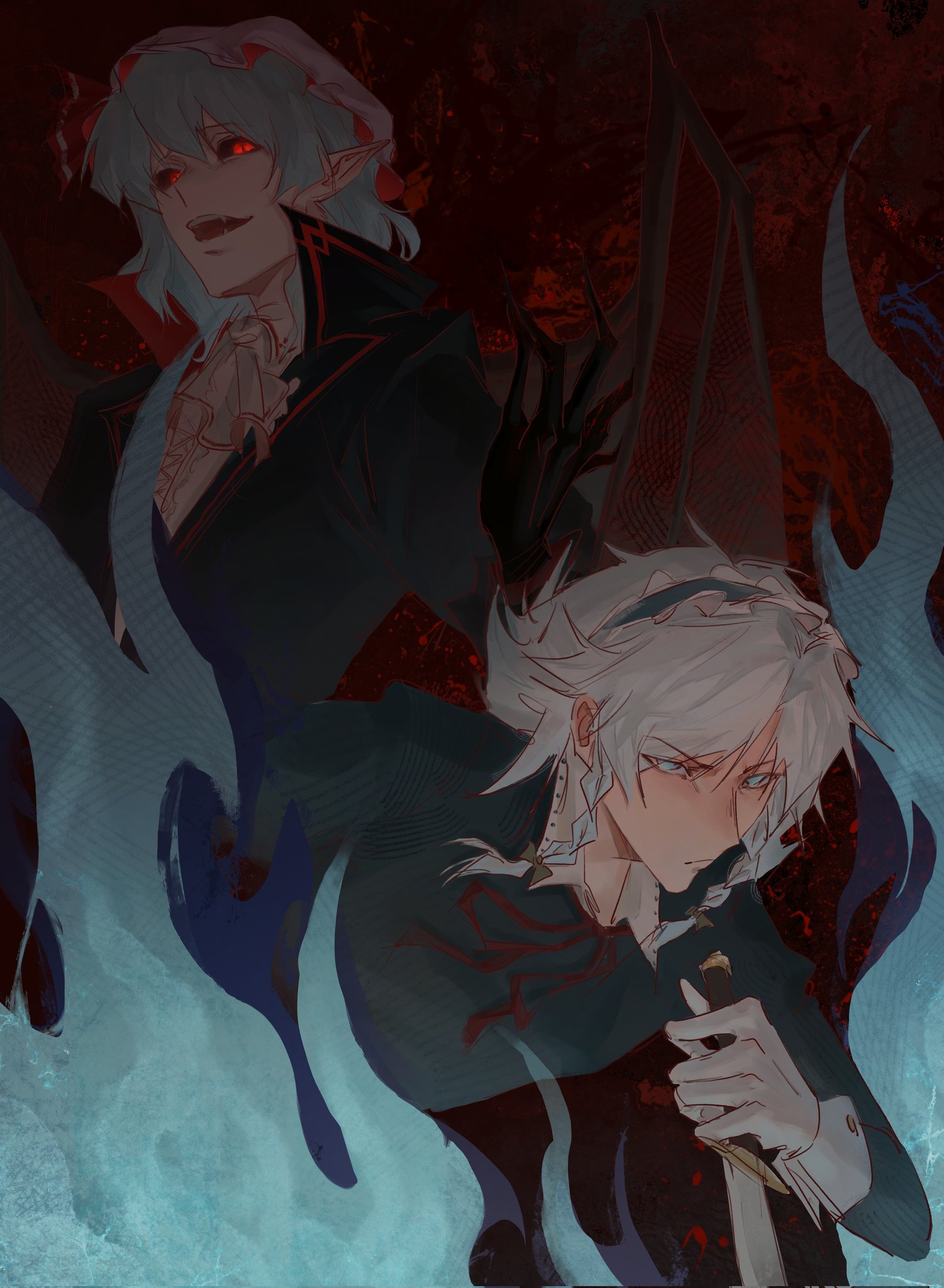 2girls320tbsycascotbat wingsblack coatblack glovesblue eyesblue hairbowbowtiebraidcoatcollared shirtfangsglovesglowingglowing eyesgreen bowgrey hairhair between eyeshathigh collarholdingholding swordholding weaponknifelong sleevesmaidmaid headdressmob capmultiple girlsopen clothesopen coatopen mouthpointy earsred bowred bowtiered eyesshirtshort hairswordtrench coattwin braidsweaponwhite ascotwhite gloveswings