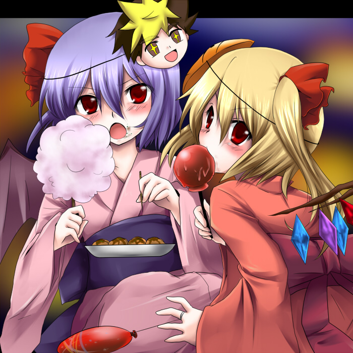 1boy2girlsalternate costumebat wingsblonde hairblue haircandy applecharacter maskcotton candyfemale focusfoodholdingholding cotton candyholding foodjapanese clotheskimonomaskmask on headmultiple girlsponytailred eyesshort hairsiblingsside ponytailsisterstakoyakiwater balloonwings