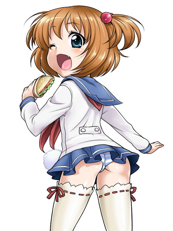 00s1girlassblue eyesblushbrown hairfangfemale focusflat chestfoodlooking backone eye closedopen mouthpantiespantyshotschool uniformserafukushort hairsimple backgroundskirtsmilesolostriped clothesstriped pantiestacothighhighstwo side upunderwearwhite thighhighswink