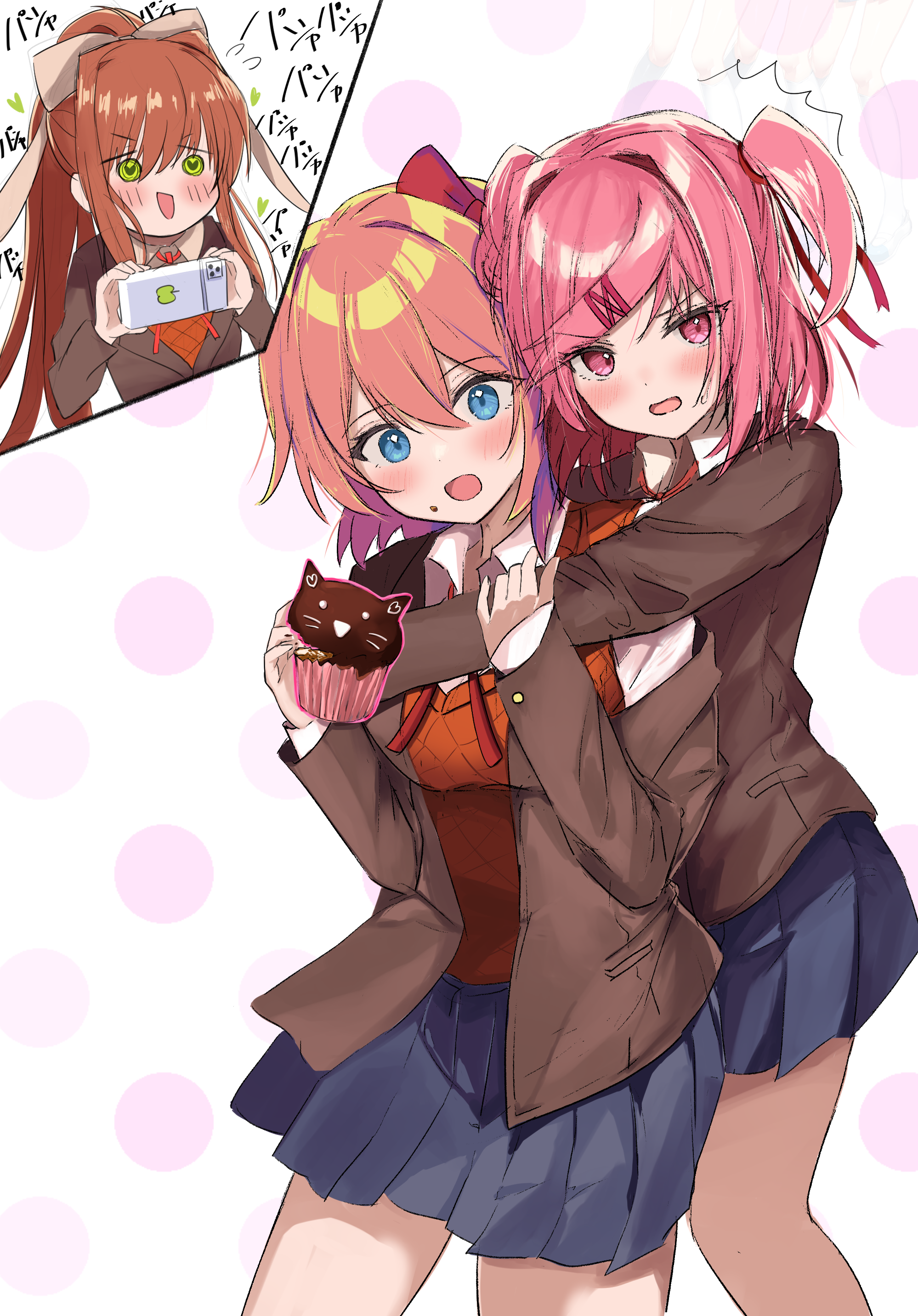2girlsblazerblue eyesblue skirtblushbowbreastsbrown jacketcollared shirtcupcakedoki doki literature club school uniformfoodgreen eyeshair bowhair intakeshands upheads togetherhughug from behindjacketlapelslayered sleeveslong hairlong sleeveslooking at anothermedium breastsminiskirtmultiple girlsneck ribbonnotched lapelsone side upopen mouthorange hairorange sweater vestphonepink hairpleated skirtponytailred bowred ribbonribbonschool uniformshirtshort hairsimple backgroundskirtsmilesweater vesttaking picturethighswhite bowwhite shirtyuri
