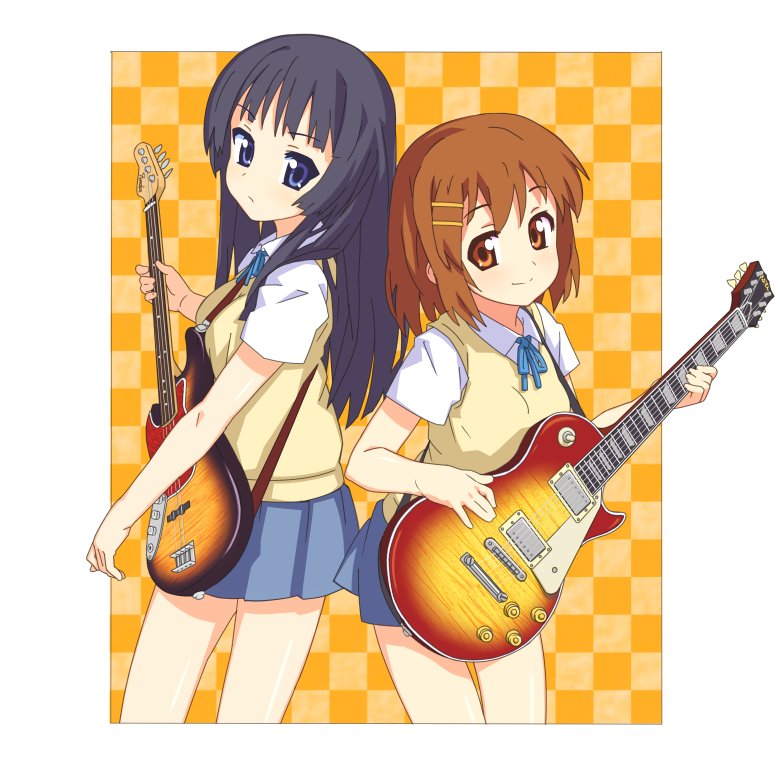 00s2girlsback-to-backblack hairblue eyesbrown eyesbrown hairelectric guitargibson les paulguitarinstrumentlong hairmultiple girlsschool uniformshort hair