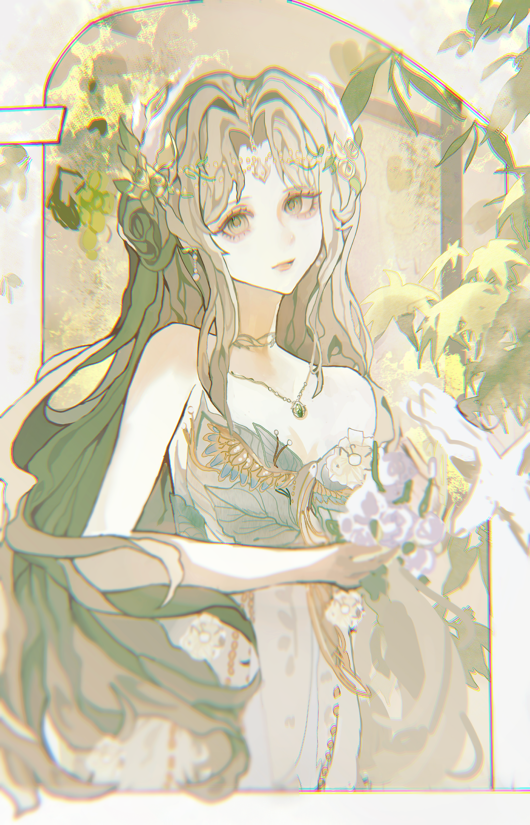 1girlanimalarchbare armsbare shouldersbirdbouquetbreastscircletcleavagecowboy shotdaydressexpressionlessfeather hair ornamentfeathersflowerforestgreen dressgreen hairhair ornamentholdingholding bouquetjewelryliyue573long hairnaturenecklaceoutdoorsoutside borderparted bangspillarsidelockssolostraplessstrapless dressvery long hairwavy hairwhite birdwhite flowerwoodland nesting (infinity nikki)