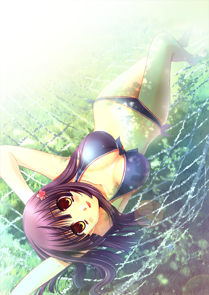 1girlarmpitsbarefootbikiniblushbreastsbrown eyesbrown haircleavagefemale focusflowerfront-tie tophair flowerhair ornamenthaircliphammocklarge breastslens flarelong hairlyingnavelside-tie bikini bottomsmilesoloswimsuittree shadeupside-down