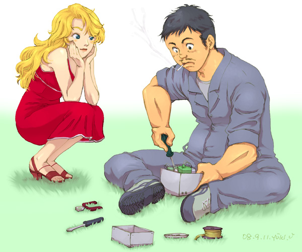 1boy1girlblonde hairbreastscigarettecoupledark skindark-skinned maledressfacial hairhands on own facehigh heelslarge breastslong hairmustacheoutdoorsscrewdrivershoesshort hairsittingsmilesmokingsquatting