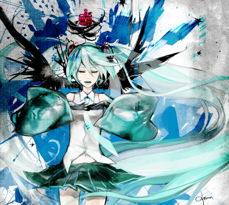 1girlaqua hairblouseblue eyescollared shirtcowboy shotcrowndetached sleevesfemale focusgloveslong hairnecktieshirtskirtsleevelesssleeveless shirtsolotwintailsvery long hairwings