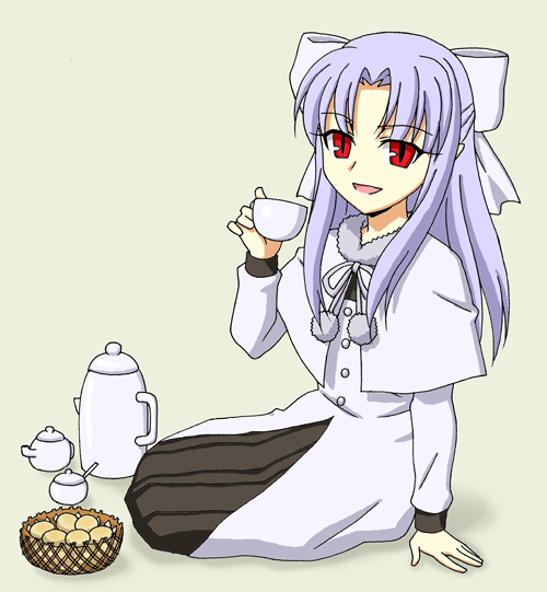 00s1girlalbinofemale focusfoodhalf updolong hairred eyesribbonsittingsmilesoloteavery long hairwhite hair