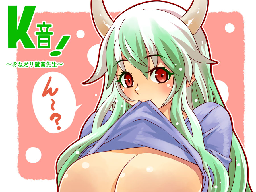 1girlanimal earsblushbreastsclothes liftfemale focushornsmouth holdmulticolored hairred eyesshirt liftsolotwo-tone hair