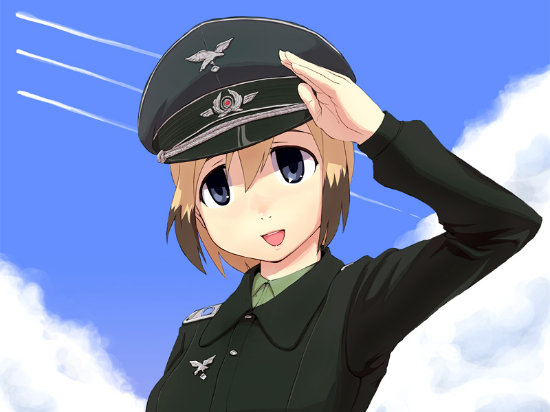 00s1girlblonde hairblue eyesclouddayfemale focushatmilitarymilitary uniformmulticolored hairoutdoorspeaked capsaluteshort hairskysolotwo-tone hair