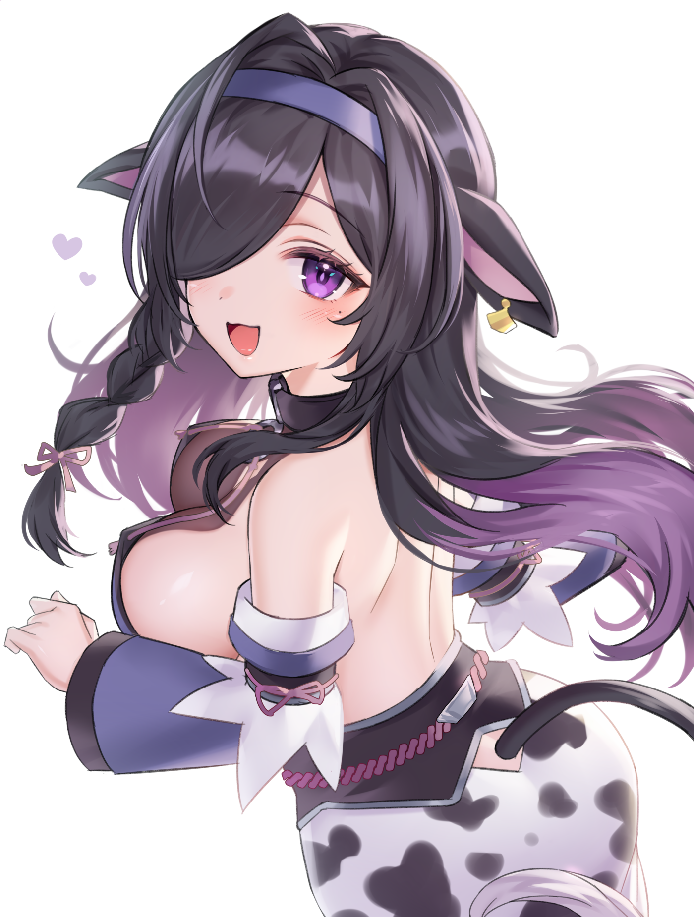 1girlahogeanimal earsanimal printass cutoutbackless kimonobackless outfitbare shouldersbelt collarblack collarblack hairblushbraidbreastscleavage cutoutclothing cutoutcollarcolored inner haircow earscow girlcow printcow tailcowboy shotdetached sleevesear taghair over one eyehair ribbonhairbandheartjapanese clotheskimonolarge breastslong hairlong sleeveslooking at viewerlooking backmolemole under eyemulticolored hairobiobijimeone eye coveredopen mouthparted bangspink ribbonprint kimonopurple eyespurple hairpurple hairbandpurple sleevesribbonribbon trimribbon-trimmed sleevessashsee-through cleavagesee-through clothesside braidsideboobsidelockssimple backgroundsingle braidsmilesolostandingtailtail through clothesvirtual youtuberwhite backgroundwide sleeves