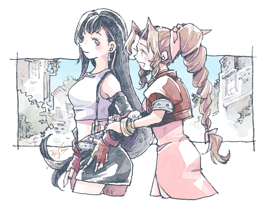 2girlsbare shouldersbeltblack hairblack skirtblack sleevesblushbraceletbraidbraided ponytailbreastsbrown hairclosed mouthcowboy shotcrop topcropped jacketcropped legsdetached sleevesdressearringselbow padsfingerless glovesfrom sideglovesgreen eyeshair ribbonhand on own hipholding another's armjacketjewelrylong hairlooking at anotherlow-tied long hairmedium breastsmidriffminiskirtmultiple girlsopen mouthoutdoorsparted bangspink dresspink ribbonponytailprofilered eyesred glovesred jacketribbonshort sleevessingle earringsingle elbow padskirtsmall breastssmilesuspender skirtsuspenderstank topteardrop earringswhite tank top