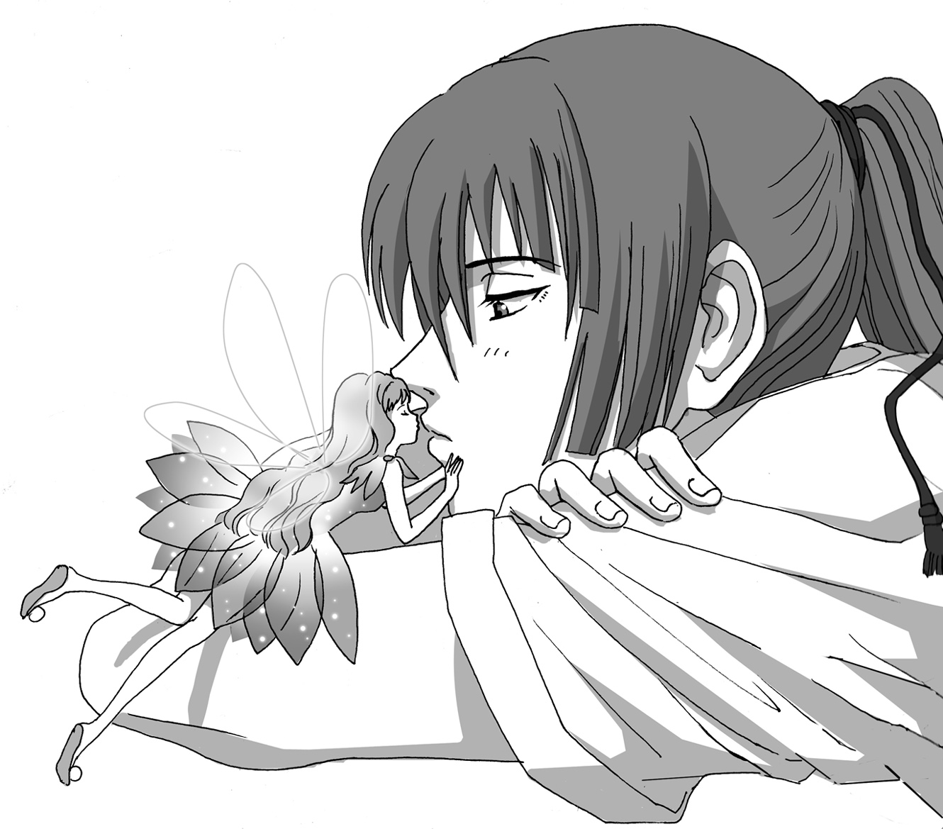 00s1boy1girlcouplefairygreyscaleheterokisslong hairmini personminigirlmonochromeponytailsize difference