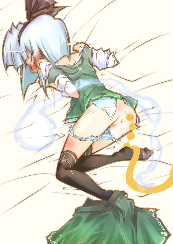 1girlanalanal beadsanal object insertionanal tailassbedblushbottomlessbutt plugclosed eyesfake tailfemale focusghosthair ribbonhitodamakneehighslolilyingobject insertionpantiesribbonsex toyshort hairsockssolostriped clothesstriped pantiestailthighhighsunderwear