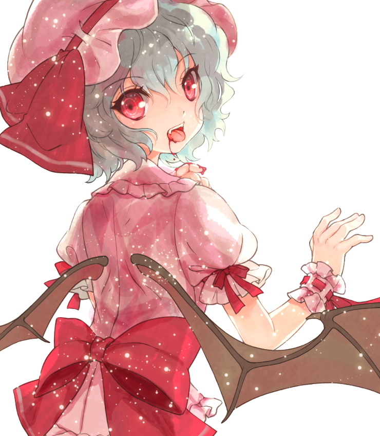 1girlbat wingsbloodblue hairfangsfemale focushatlooking backred eyesshort hairsimple backgroundsolowhite backgroundwingswrist cuffs