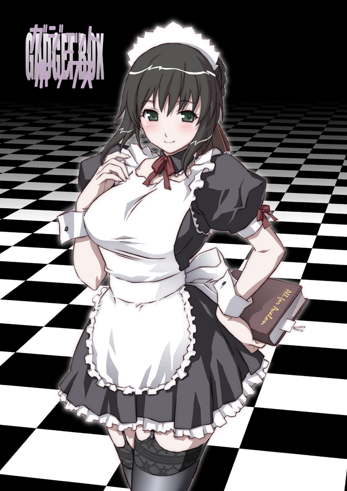 1girlapronblack hairblushbookbreastsfemale focusgreen eyeslarge breastsmaidmaid apronmaid headdresssolothighhighs