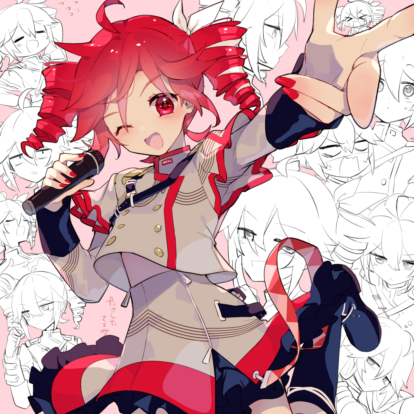 :d1girlahogebuttonscharacter backpackdouble-breasteddrill hairfrilled skirtfrillsgrey jacketgrey shirtgrey skirthands upholdingholding microphonejacketlong sleeveslooking at viewermicrophonemidriff peekmusical staffmusical staff printone eye closedopen mouthoutstretched armred eyesred hairred nailsred trimshirtshoulder beltshoulder boardsskirtsmilesolostandingstanding on one legtwin drills