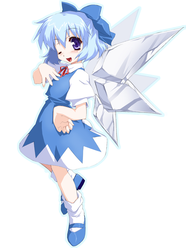 1girlblue eyesblue hairbowfemale focusfull bodyhair bowhand on own hiphip focusmary janesmatching hair/eyesshoesshort hairsolowhite backgroundwingswink