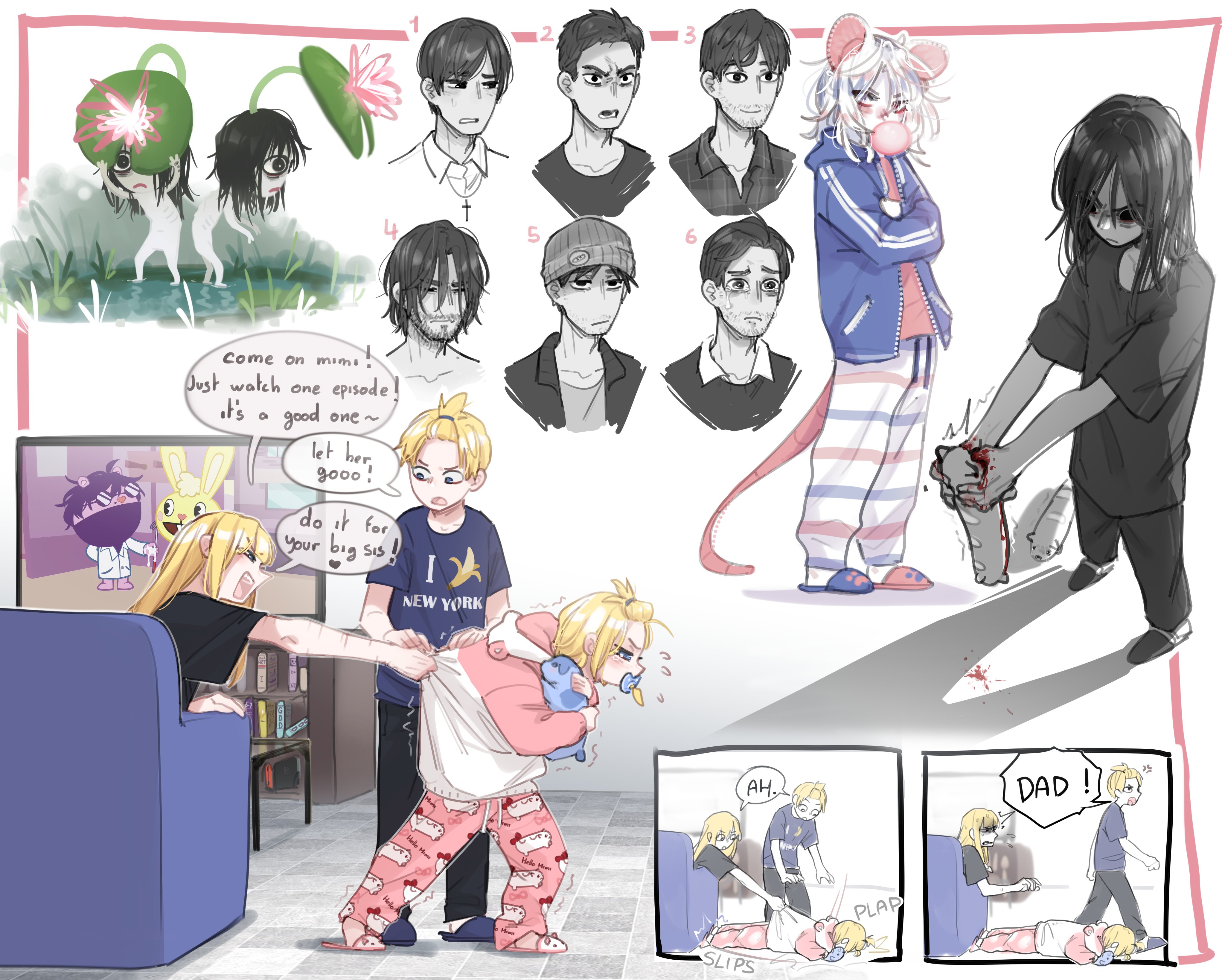 2boys6+girlsanimal earsbeardblack hairblack pantsblack shirtblonde haircouchenglish textfacial hairhatholdingholding stuffed toyjacketmouse earsmouse girlmouse tailmultiple boysmultiple girlsmultiple viewspacifierpantspink jacketpink pantsscarscar on armself-harm scarshirtshoesshort hairshort sleevesspeech bubblestandingstriped clothesstriped pantsstuffed animalstuffed toytailtelevisionwaterwhite jacket