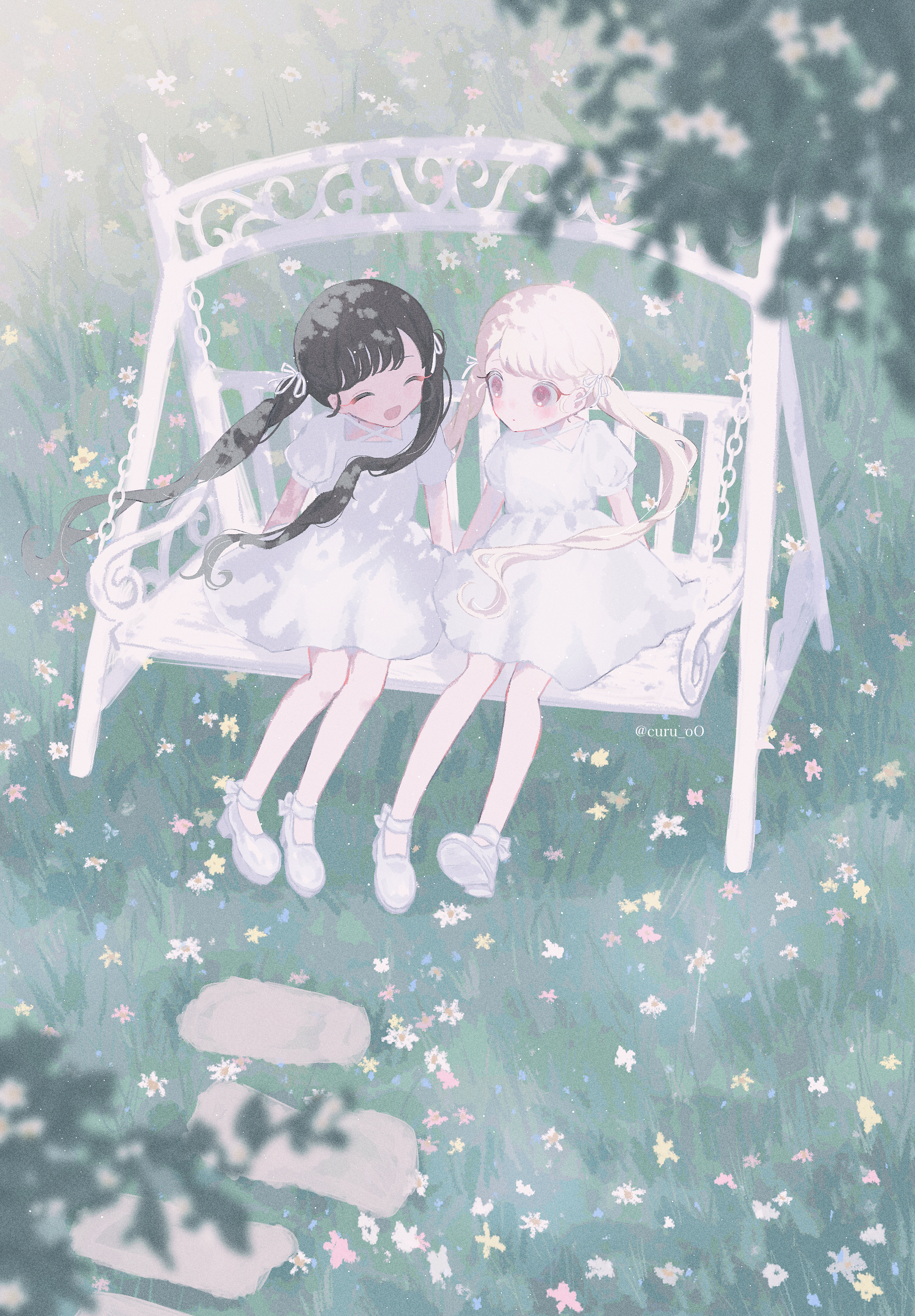 :d2girlsankle strapblack hairblurryblurry foregroundclosed mouthcurusucururidressfacing anotherfloating hairflower bedgrasshair ribbonlong hairlooking at anothermultiple girlson swingopen mouthoutdoorspatio swingpink eyespuffy short sleevespuffy sleevesribbonshoesshort dressshort sleevessittingsmilestrappy heelsswept bangsswingtwintailstwitter usernamevery long hairwhite dresswhite hairwhite ribbonwhite shoeswind