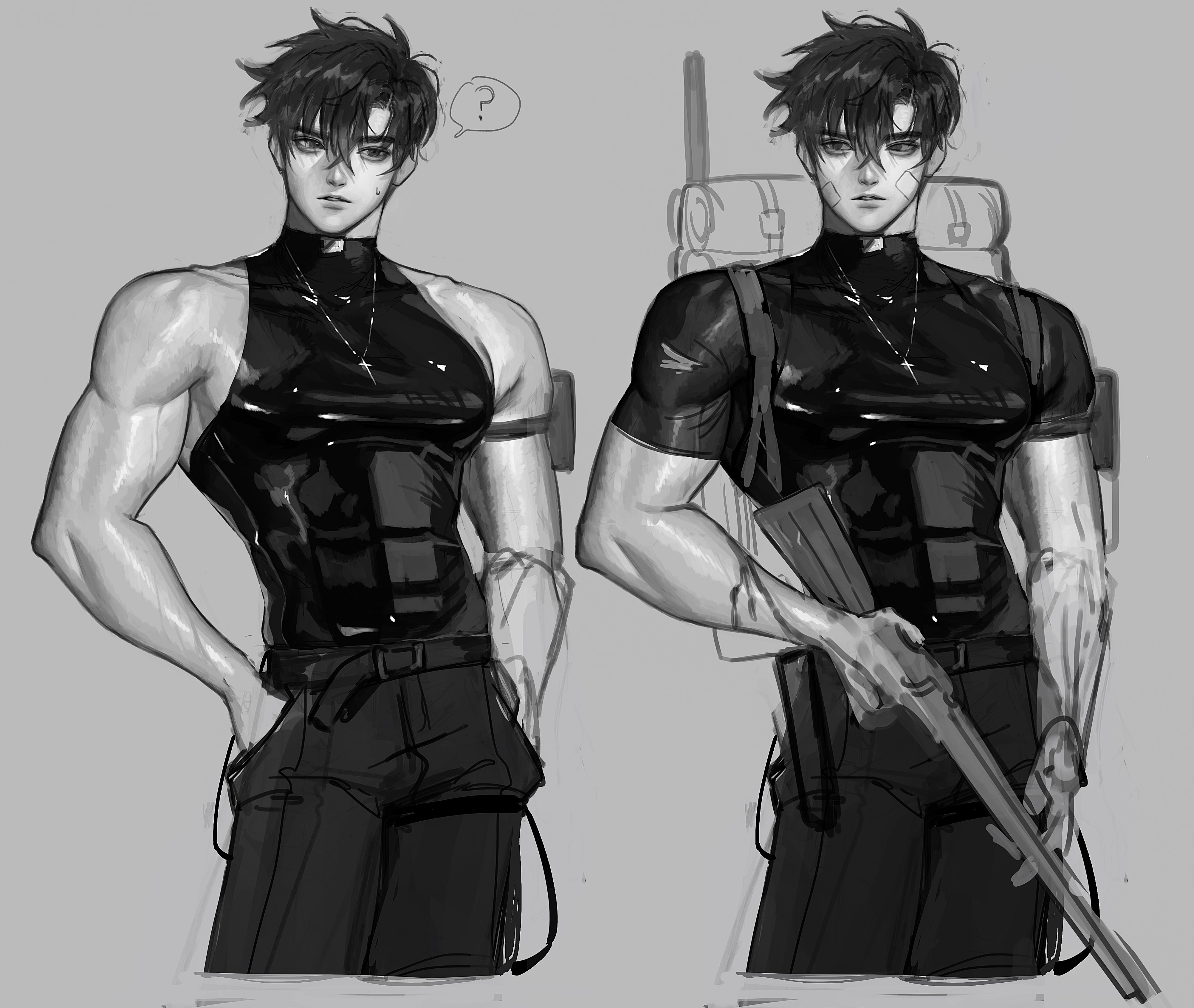 asaba harumasa, zenless zone zero, highres, 1girl, black choker, black hair, black necktie, black skirt, choker, full body, genderswap, genderswap (mtf), headband, holding, jewelry, long hair, necklace, necktie, partially colored, shirt, simple background, skirt, solo, user hgfp5375, white background, white shirt, yellow eyes, yellow headband