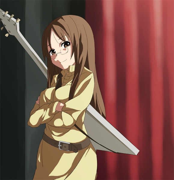 00s1girlbeltbrown haircrossed armsdressfemale focusgibson flying vglassesguitarinstrumentsolosweatersweater dressteacher