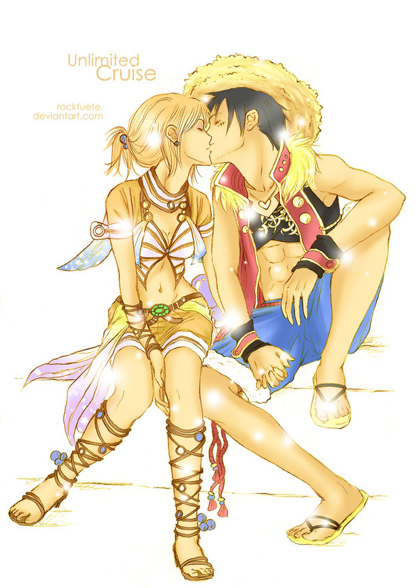 1boy1girlblack hairbreastsclosed eyescouplehatheartheteroholding handsjewelrykissnecklaceorange hairponytailsandalsscarshort hairsparklestraw hat