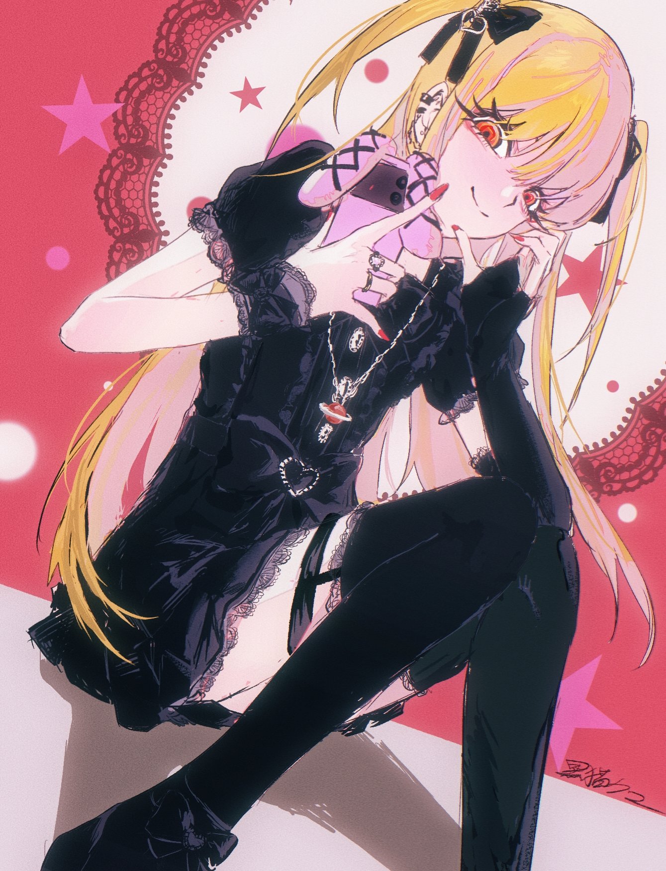 1girlalternate costumeblack bowblack dressblack shoesblack thighhighsblonde hairbowclosed mouthdresshair between eyeshalf-heart handsholdingholding phonejirai keiknees together feet apartlegwear garterlong hairphonered eyesred nailsshadowshoessittingsmilesolostar (symbol)thighhighstwo side up