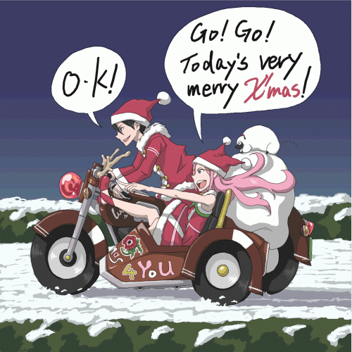 00s1boy1girlbare armsbare shouldersblack hairblue backgroundchristmascreatureenglish textengrish textflashing lightfrom sidefull bodygift baggradient backgroundhappyhatleaning forwardlegs uplong hairmerry christmasmotor vehiclemotorcycleno socksopen mouthoutdoorspink hairpointingranguageridingsanta costumesanta hatshort hairsidecarsittingsmilesnowspeech bubble