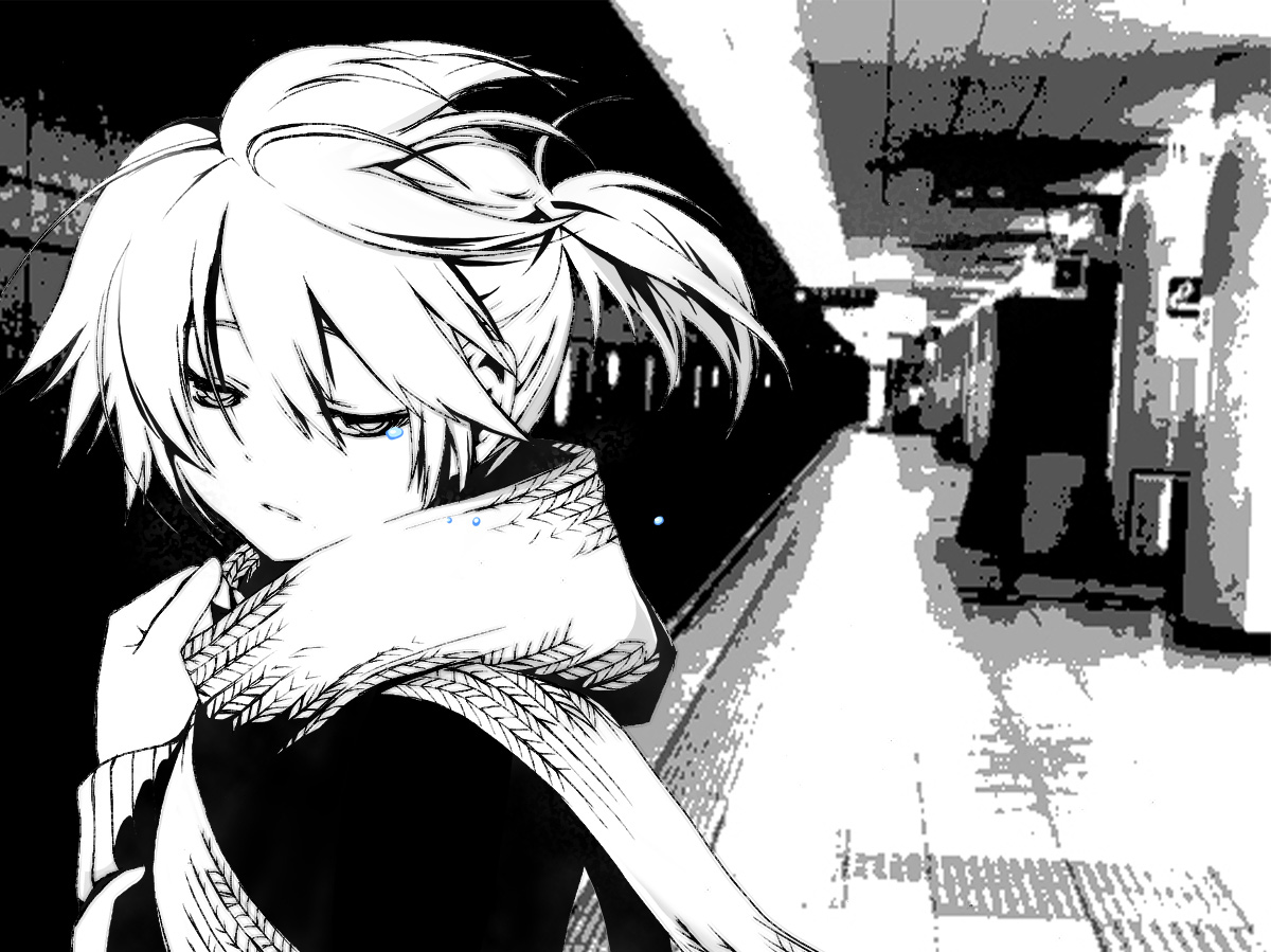 1boygreyscalehair between eyeshalf-closed eyeshigh contrastmale focusmonochromesadscarfshort hairsolospot colorsubwaytactile pavingtearstrain stationupper body