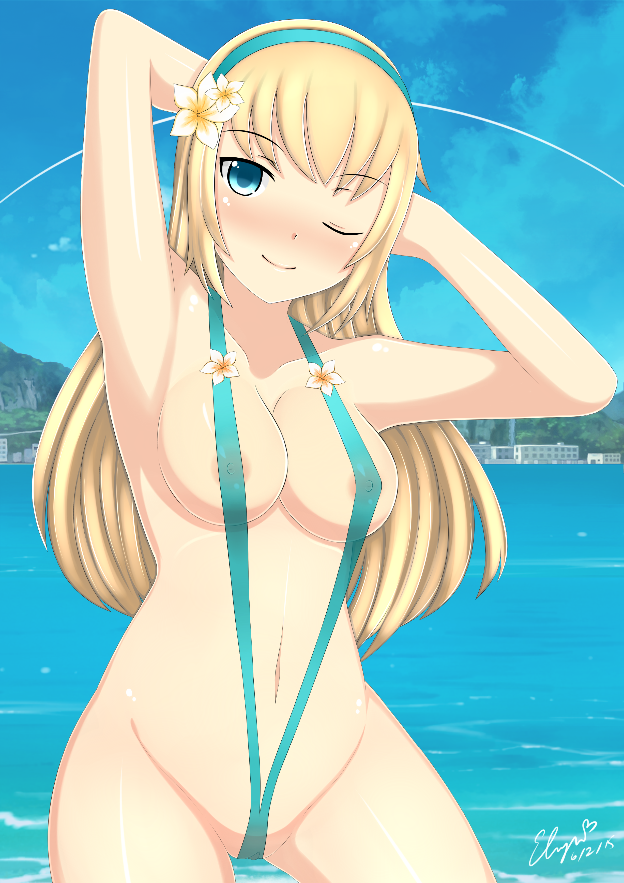 alternate hairstylearms upbikiniblonde hairblue eyesblushbreastsfemaleFlag for Deletionflowerhair flowerhair ornamenthairbandlong hairlooking at viewernavelnipplesnudeoutdoorssee throughsling bikinismilesoloswimsuitwaterwink