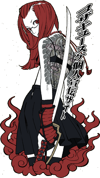 1girlbrafemale focusfingerless glovesglassesglovesirezumijewelrylingerielooking backnecklacered eyesred hairskirtsoloswordtattoothighhighsunderwearweapon