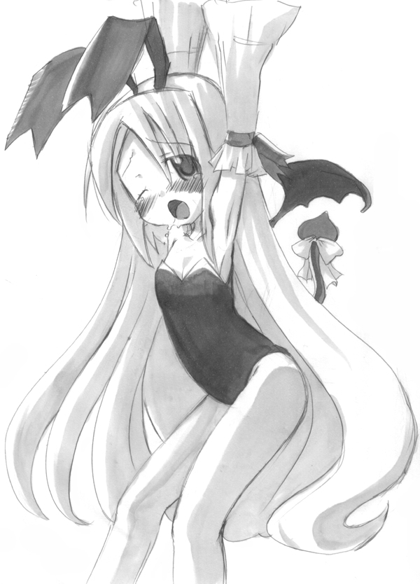 1girlbat wingsblushbowdemon girldetached sleevesfallen angelfemale focusflat chestgreyscaleinklolilong hairmonochromeplayboy bunnysolotailtail bowtail ornamentwings
