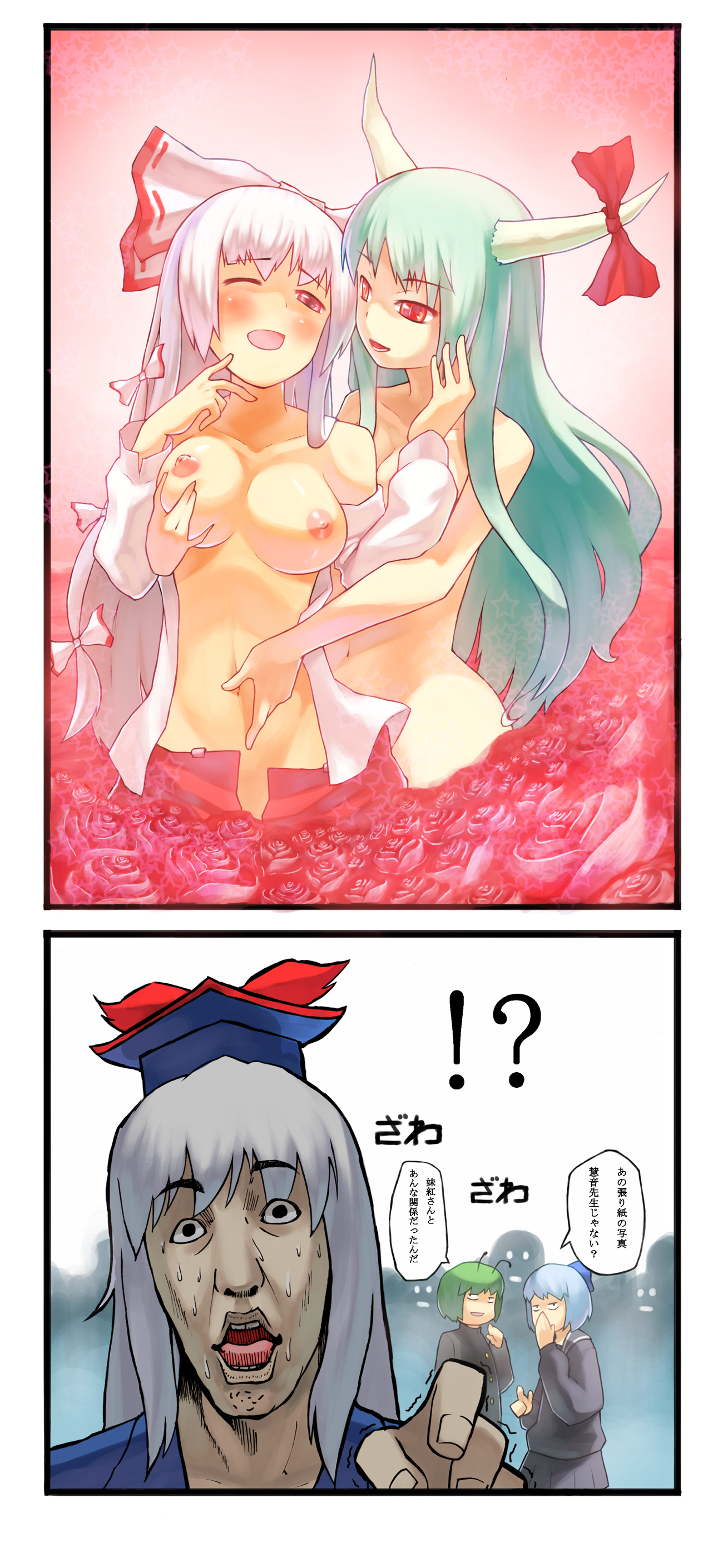 4girlsalternate costumeantennaeblue hairbowbreastsflowergrabbing another's breastgreen hairgropinghair bowhair ribbonhathornslarge breastslong hairmultiple girlsnipplesnudeopen clothesopen shirtparodyred eyesribbonroseschool uniformshirtshort hairwinceyuri