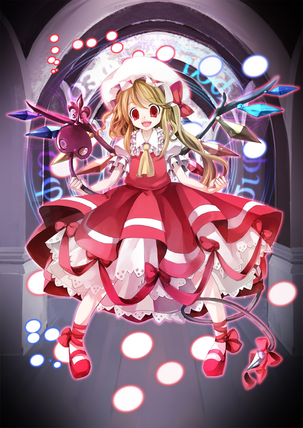 1girlblonde hairdanmakufemale focushatindoorslong hairpolearmponytailred eyesribbonside ponytailsolospearweaponwings
