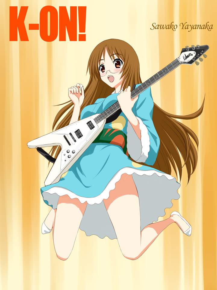 00s1girlbrown eyesbrown hairfemale focusfull bodygibson flying vglassesguitarinstrumentjapanese clothesjumpingkimonolong hairshort kimonoshort yukatasolotypoyukata