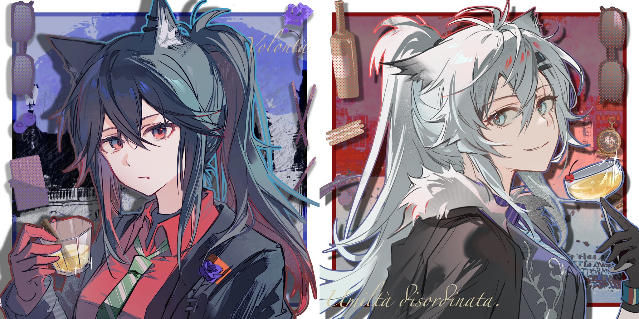 2girlsanimal ear piercinganimal earsaqua eyesblack eyesblack glovesblack hairblack jacketbolo tiecollared shirtcolored inner hairdrinkfur trimfur-trimmed jacketglintglovesgrey hairhair between eyeshair ornamenthairclipholdingholding drinkitalian textjacketlong hairlong sleeveslooking at viewermulticolored eyesmulticolored hairmultiple girlsofficial alternate costumeparted lipsponytailred eyesred glovesred hairred shirtscarscar across eyescar on faceshirtsmiletwo-tone eyesupper bodywolf earswolf girl