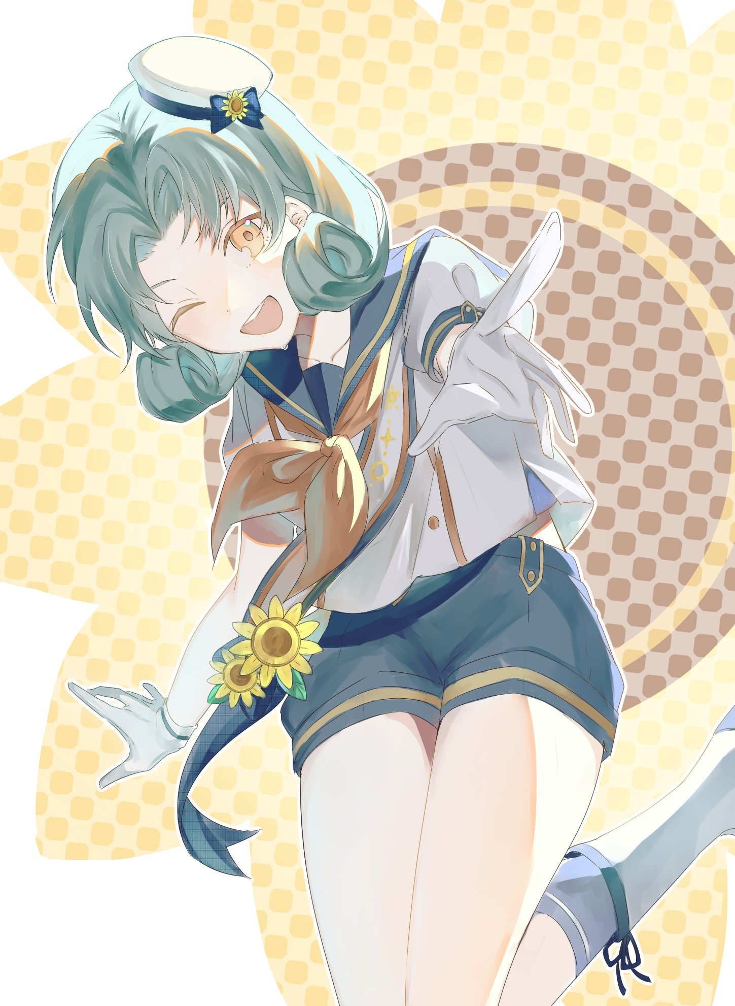 1girlblue sailor collarblue shortscowboy shotflowerglovesgreen hairhatleg uplooking at viewerneckerchiefone eye closedopen mouthorange eyesorange neckerchiefoutstretched armsailor collarsailor hatsailor shirtshirtshort sleevesshortssmilesolostandingsunflowerwhite gloveswhite shirt