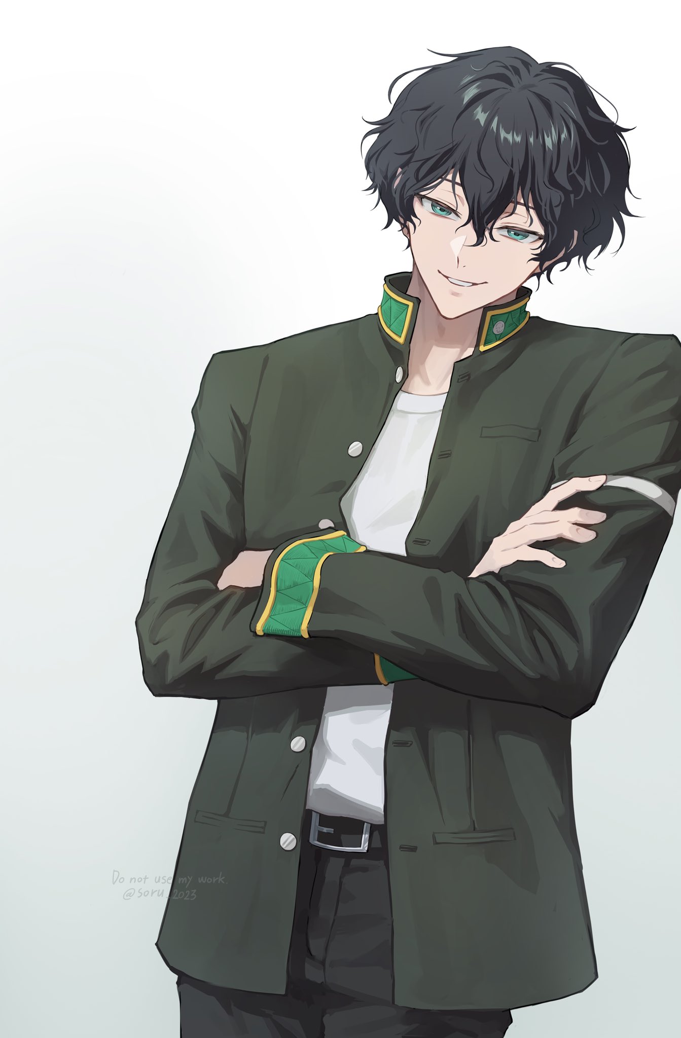 1boybeltblack beltblack haircrossed armsgreen jacketjacketlong sleevesmale focusopen clothesopen jacketschool uniformshirtshort hairsmilesolowhite backgroundwhite shirt