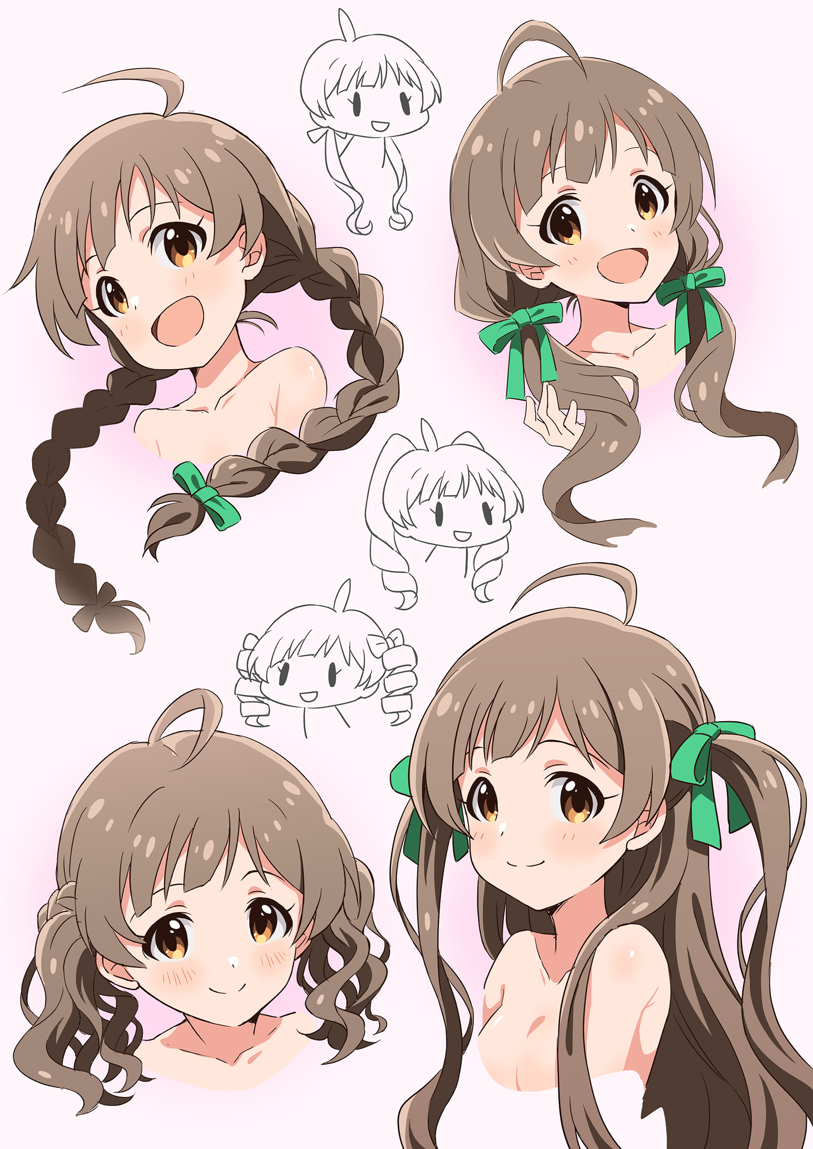 1girlahogealternate hairstylebowbraidbrown eyesbrown hairclosed mouthgreen bowhair bowlong hairlow twintailsmultiple viewsopen mouthsimple backgroundsmiletwin braidstwintailstwo side upwhite background