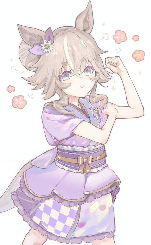 1girlanimal earsblue eyesblushbowbreastsclosed mouthear bowear flowerear ornamentflexingflowergrey hairhair between eyeshair bunhorse earshorse girlhorse tailjapanese clotheskimonolong hairlooking at viewermulticolored hairpink kimonopurple bowpurple kimonosashsimple backgroundsmilesolostreaked hairtailwonder acute (soft light - hot spring scented outfit) (umamusume)