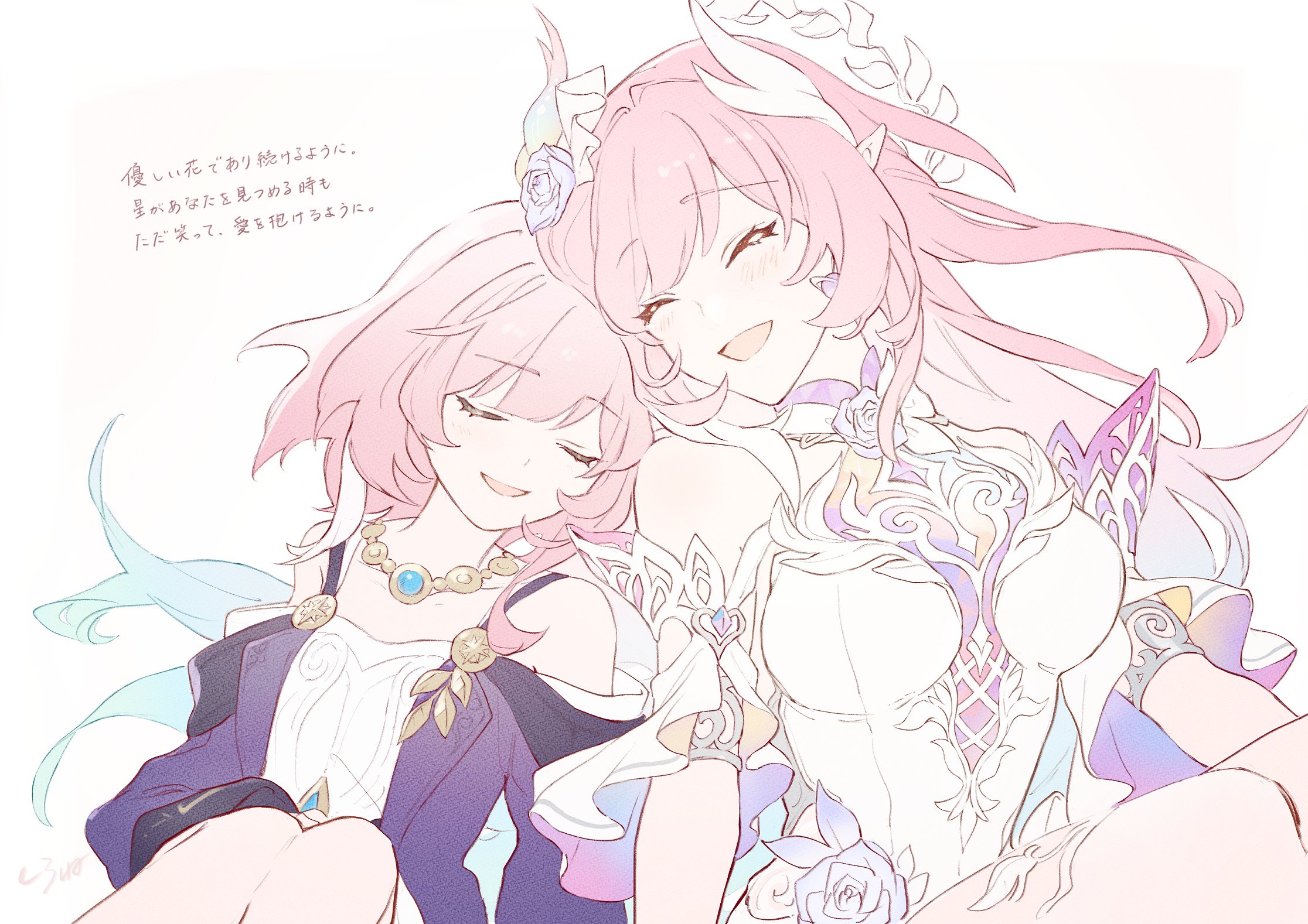 2girlsbare shouldersblue hairbreastsclosed eyesdetached sleevesdressearringsgradient hairjewelrylarge breastslong hairmedium hairmulticolored hairmultiple girlsopen mouthpink hairpurple dresssingle earringsittingwhite dress