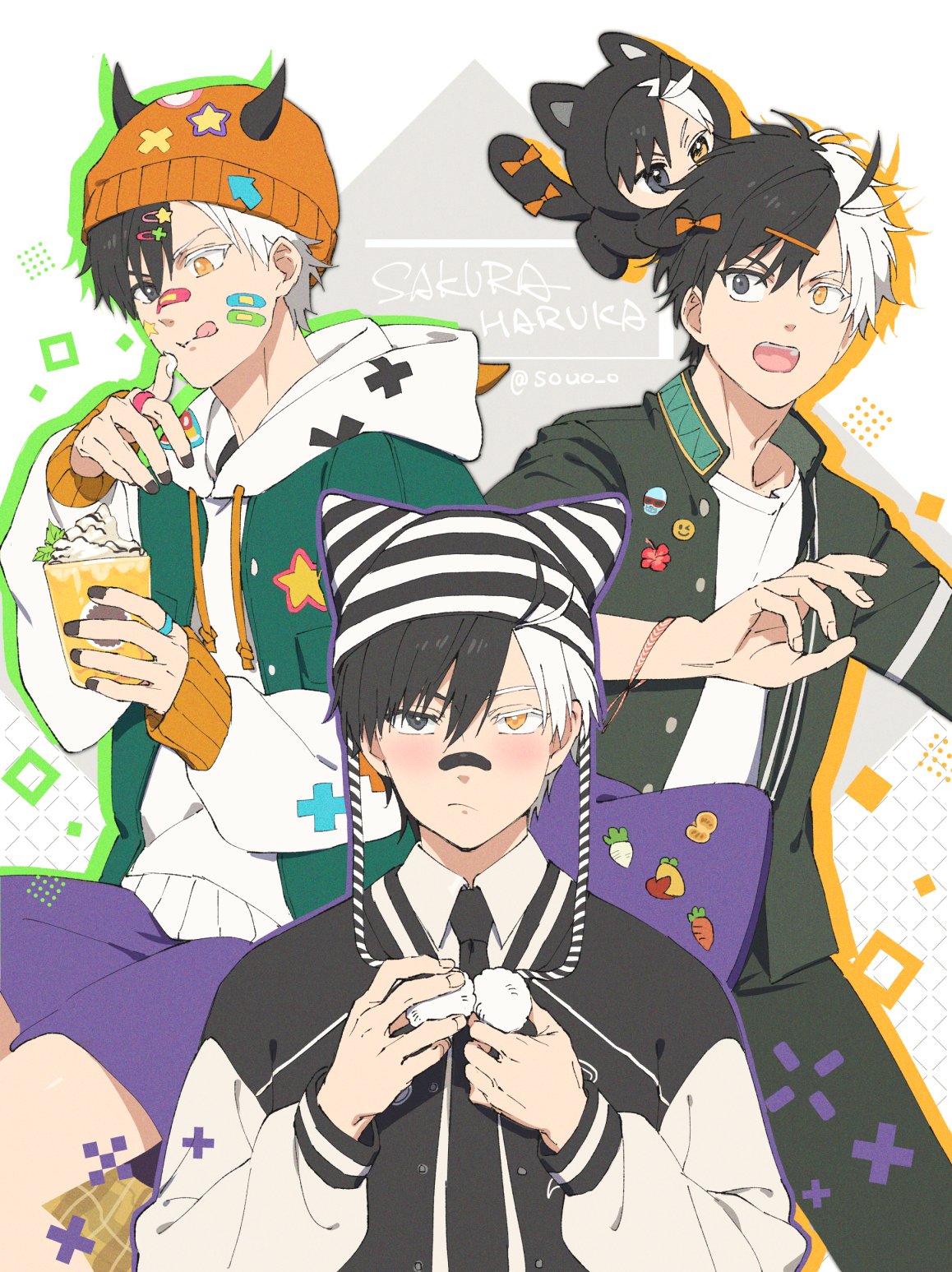 1boyalternate costumebandaidbandaid on faceblack haircreamcupdrawstringgreen jackethatheterochromiahoodhooded jacketjacketjewelrylong sleeveslooking at viewermale focusmulticolored hairmultiple viewsnecktieopen mouthpantsringschool uniformshirtshort hairsplit-color hairstriped hatv-shaped eyebrowswhite hairwhite shirtyellow eyes