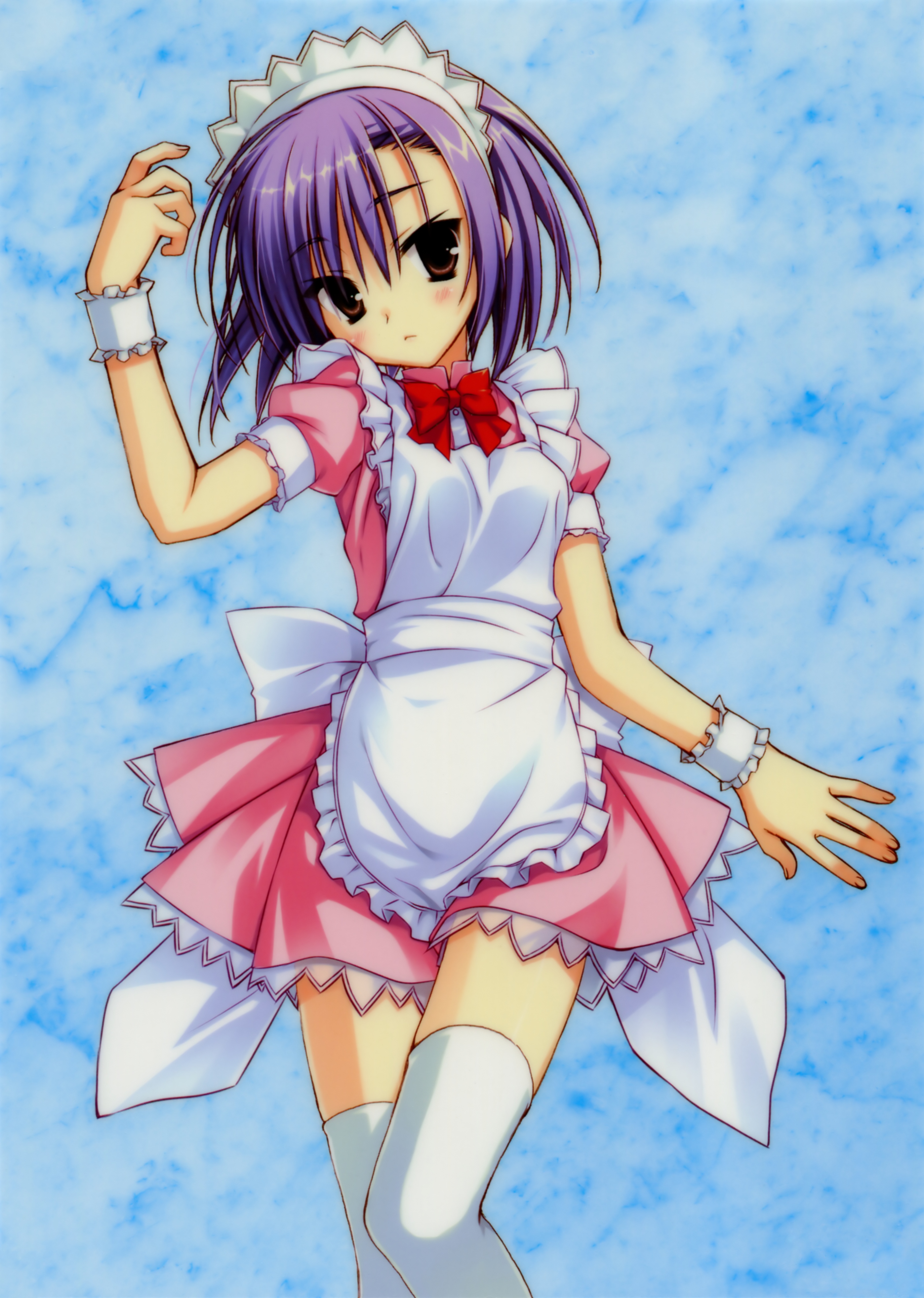 1boy1girlapronblushbowbowtiebrown eyesfemale focusmaidmaid apronmaid headdresspurple hairshort hairsolothighhighswhite thighhighswrist cuffszettai ryouiki