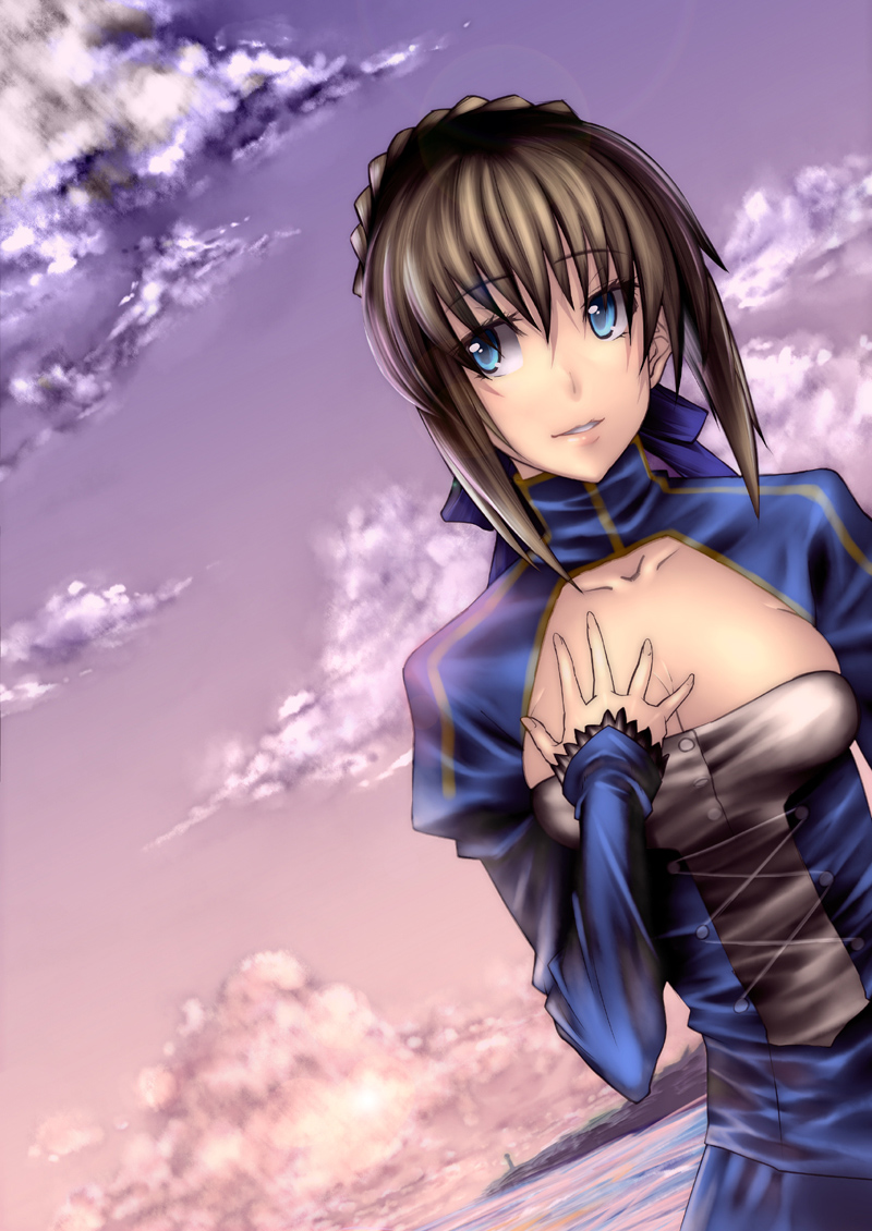 00s1girlalternate hair colorblue eyesbreastsbrown haircleavagecloudfemale focusmedium breastsskysolosunset