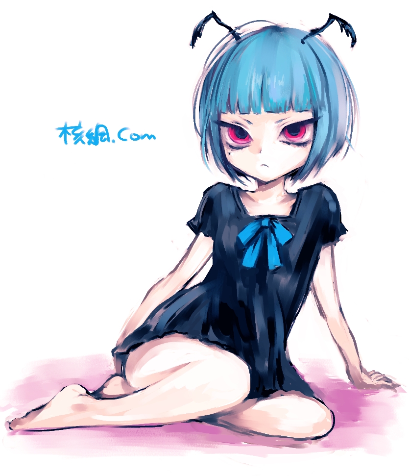 1boy1girlantennaearm supportbarefootblue haircamisolechildfeetfemale focuslegsmolemole under eyepink eyesshort hairsittingsolo