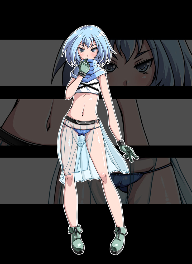 1girlaqua hairbikiniblue eyesblushbootscameltoefemale focusflat chestlowleglowleg bikininavelscarfsee-through clothesshort hairskirtsolosports braswimsuitzoom layer