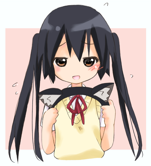 00s1girlanimal earsblack hairbrown eyescat earscat girlfemale focushairbandlong hairneck ribbonred ribbonribbonschool uniformsimple backgroundsolosweater vesttwintails